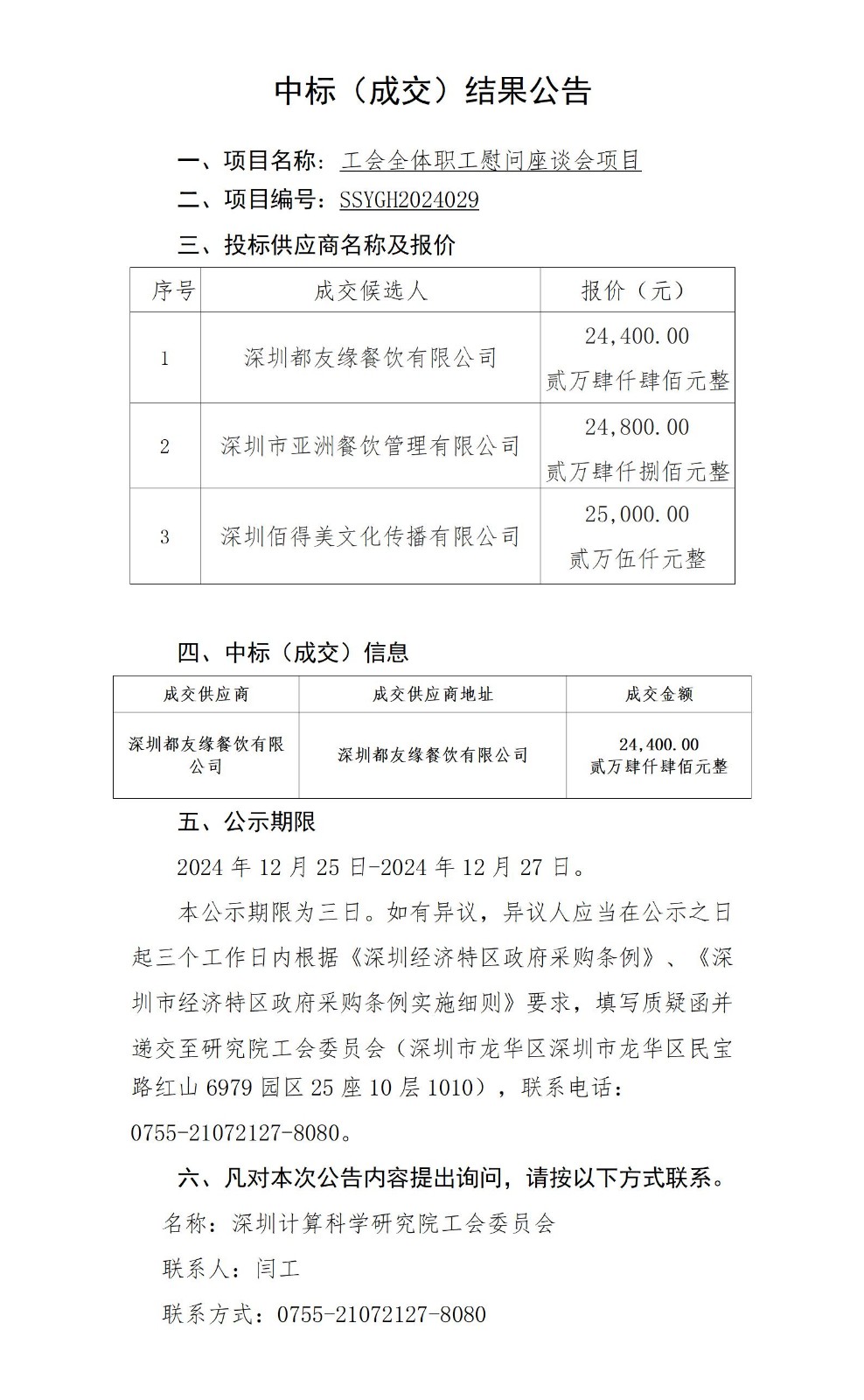 深算院工会关于工会全体职工慰问座谈会项目,经批准采用三方询价的采购方式,现将中标(成交)结果予以公示。